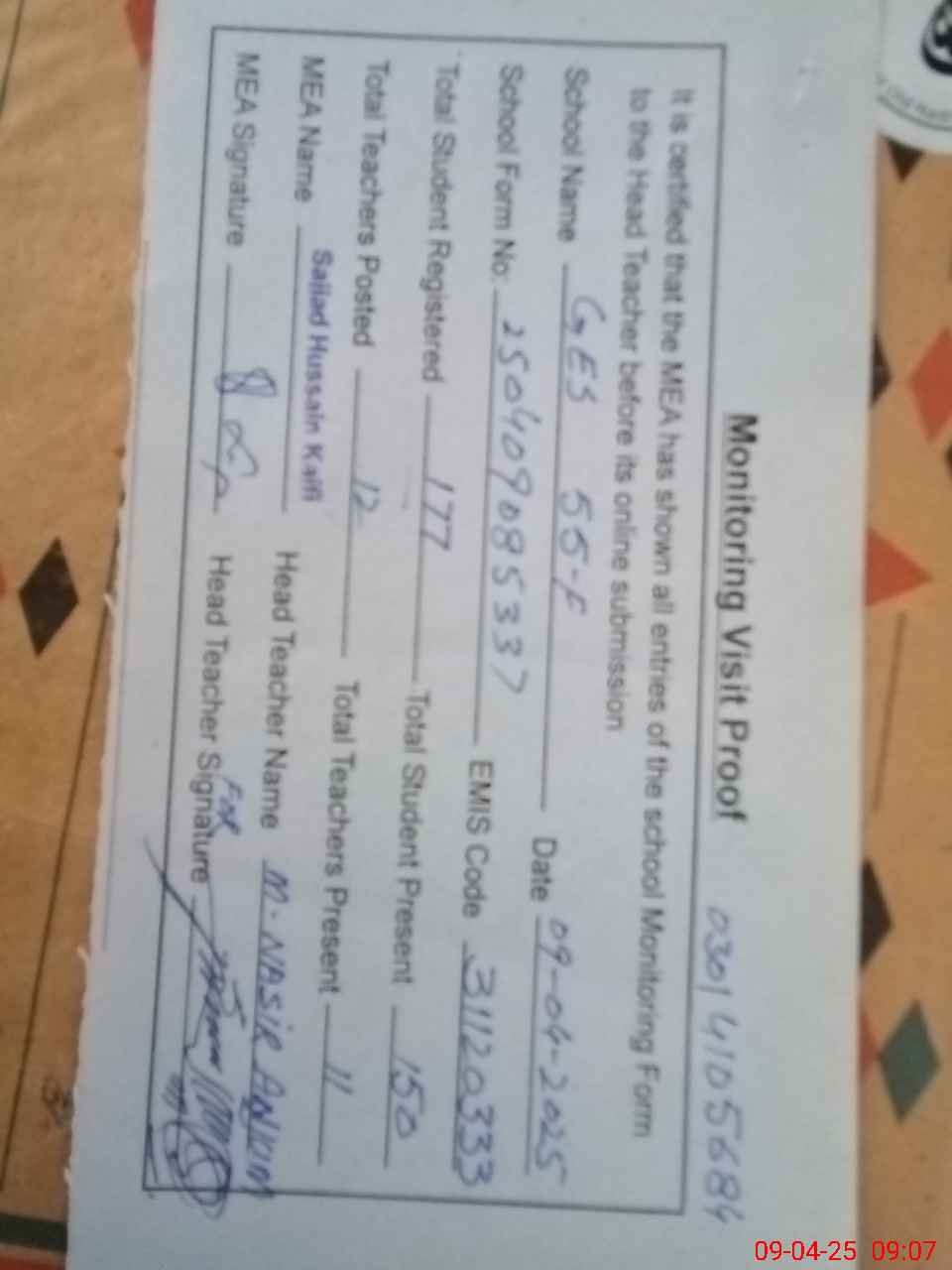 | Attendance Register | Head Teacher | MEA with School | Visit Proof |