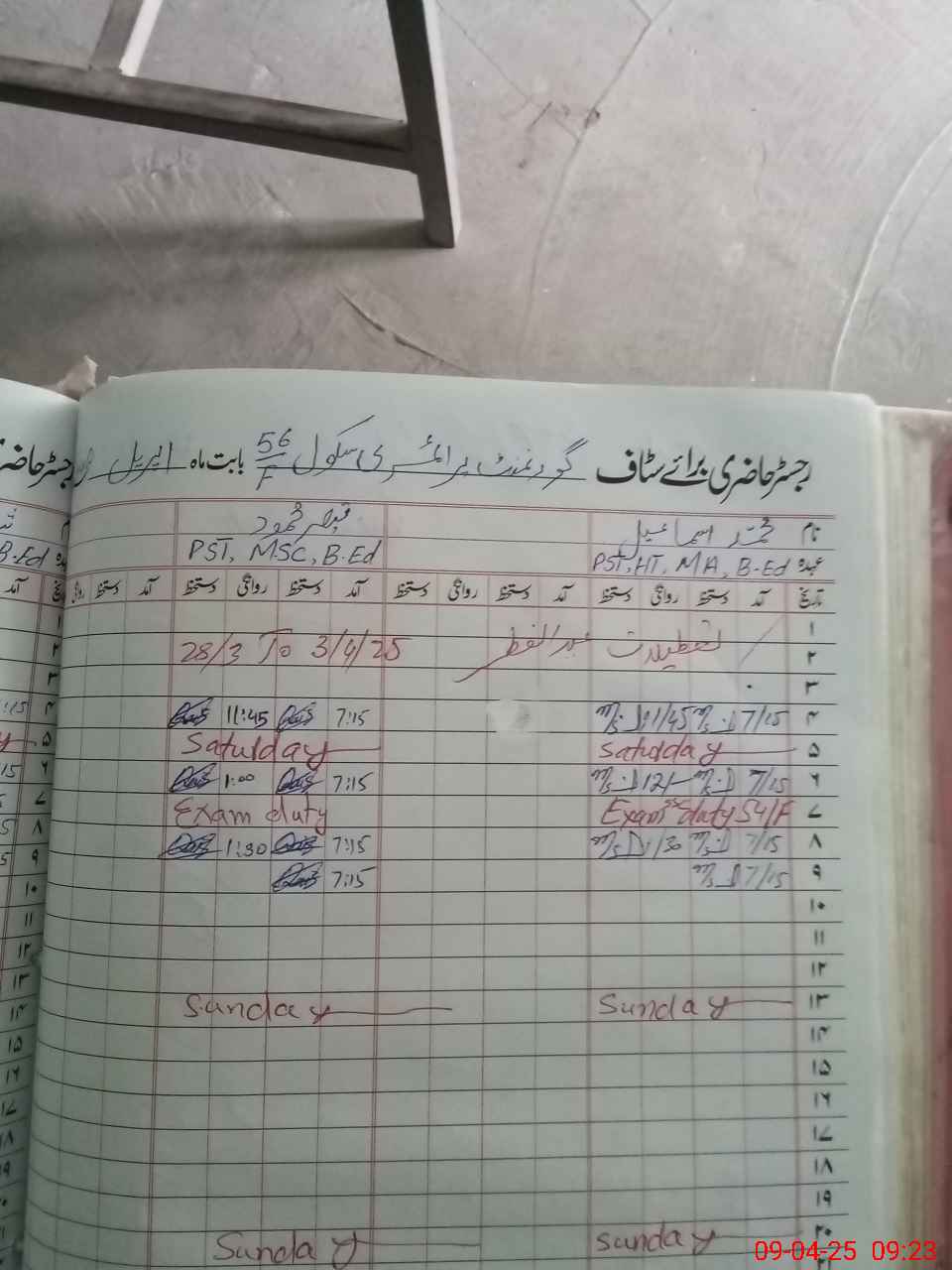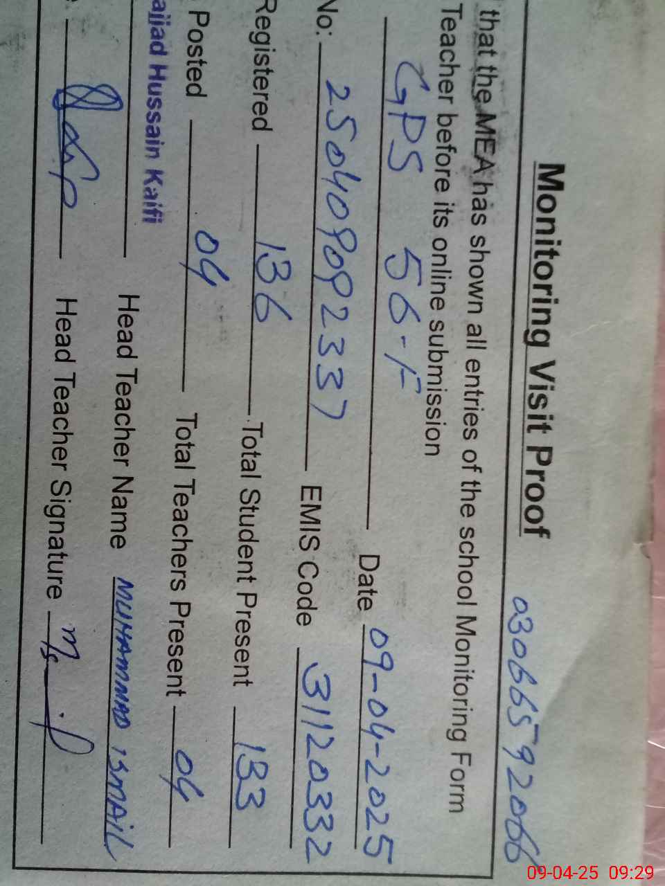 | Name: Qa**** Ma**** Designation: (School Headmaster's/Headmistress's) PST Phone/Cell Number: 03**** |
