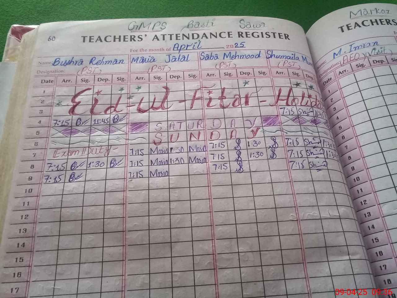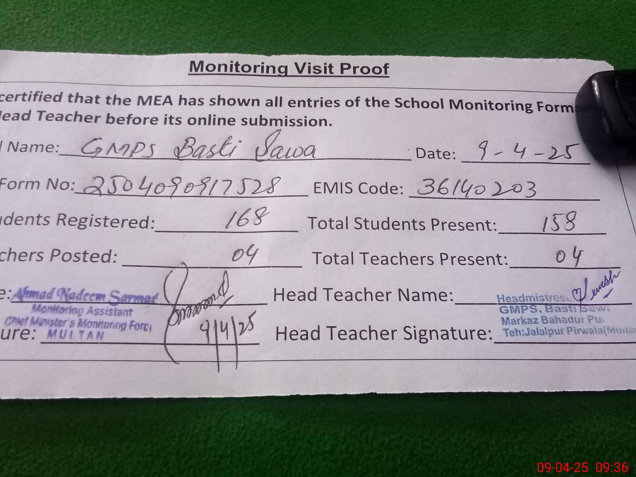 | Attendance Register | Head Teacher | MEA with School | Visit Proof |
