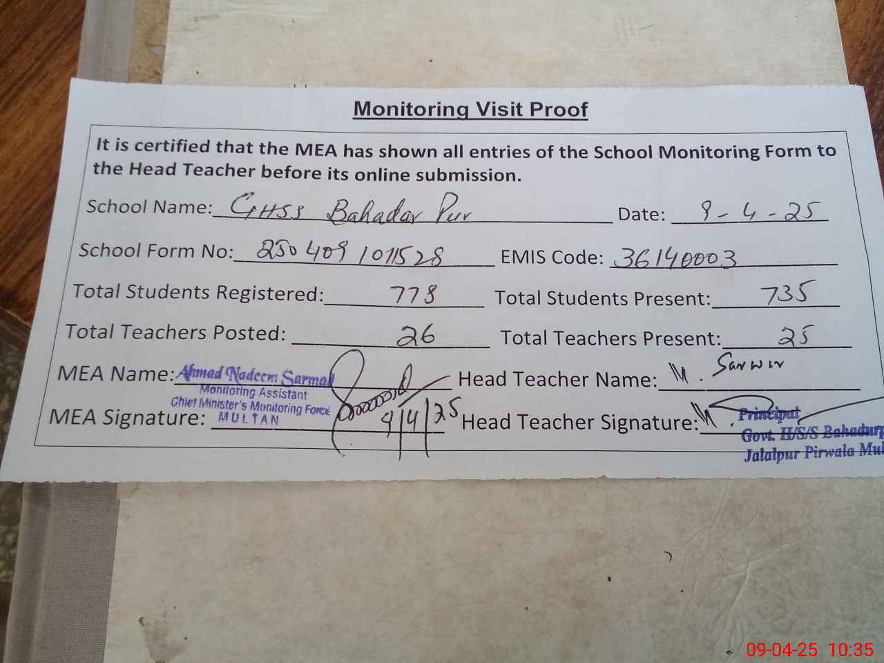 | EMIS Code: 36140003 | Name of School: GHSS BAHADAR PUR | |||
