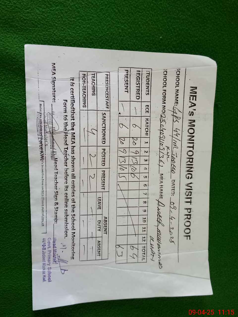 | Attendance Register | Head Teacher | MEA with School | Visit Proof |