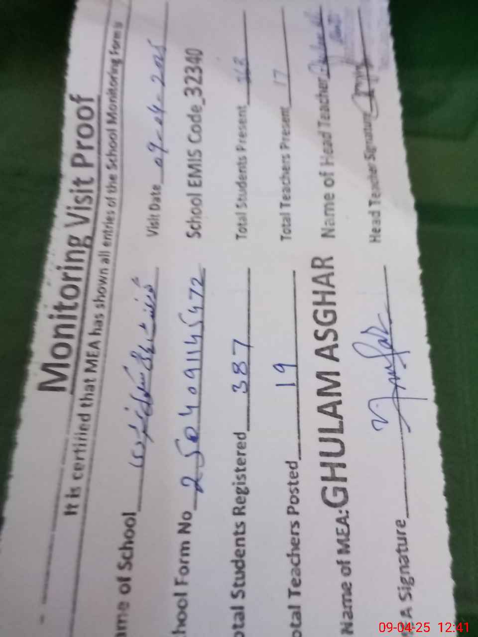 | Name: Gh**** Al**** Designation: (School Headmaster's/Headmistress's) Head Master Phone/Cell Number: 03**** |