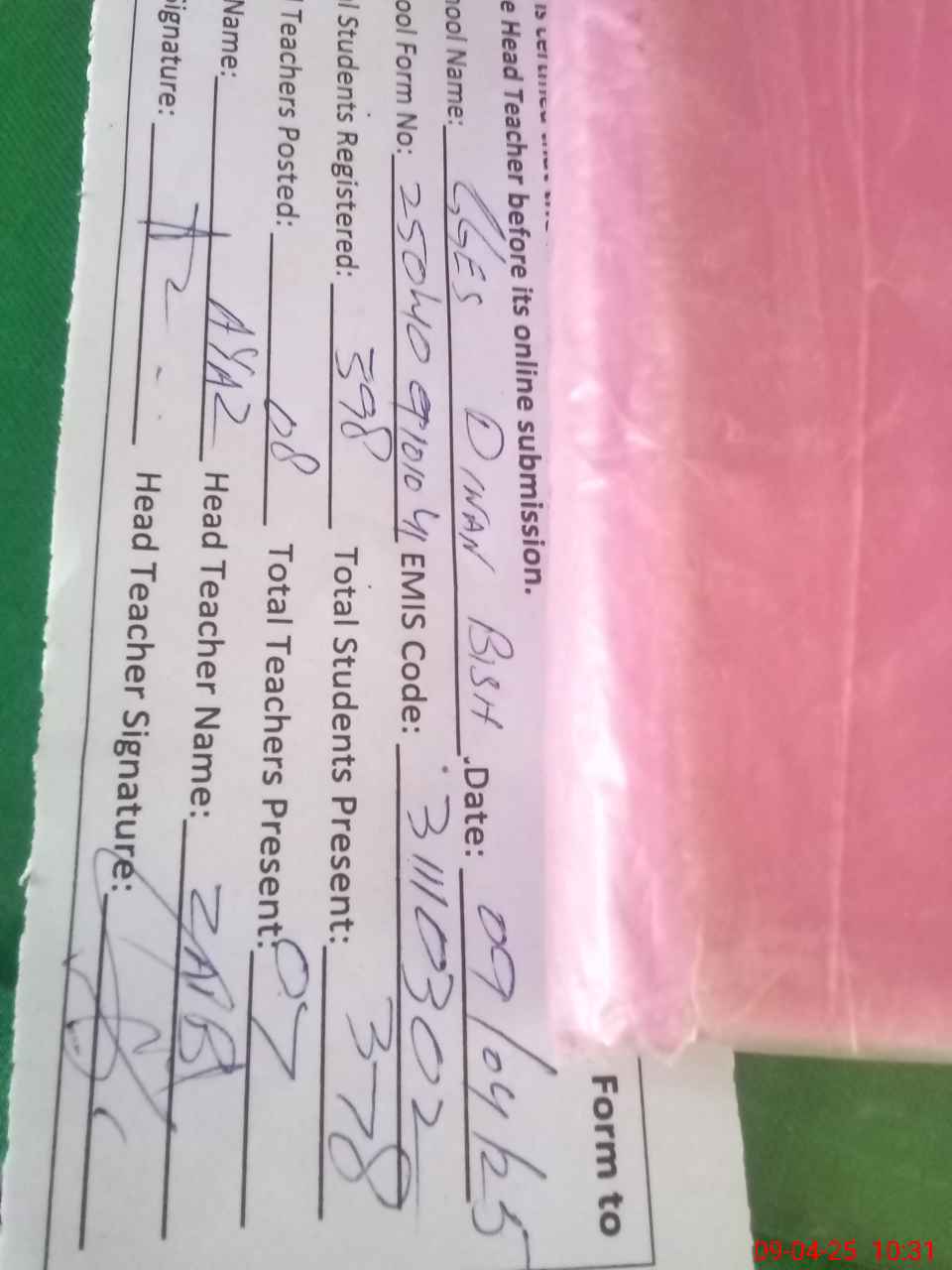 | Name: Re**** Sa**** Designation: (School Headmaster's/Headmistress's) EST Phone/Cell Number: 03**** |
