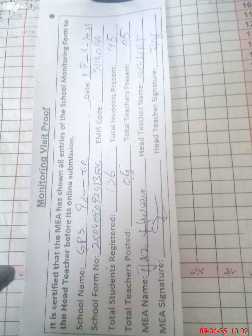 | Attendance Register | Head Teacher | MEA with School | Visit Proof |