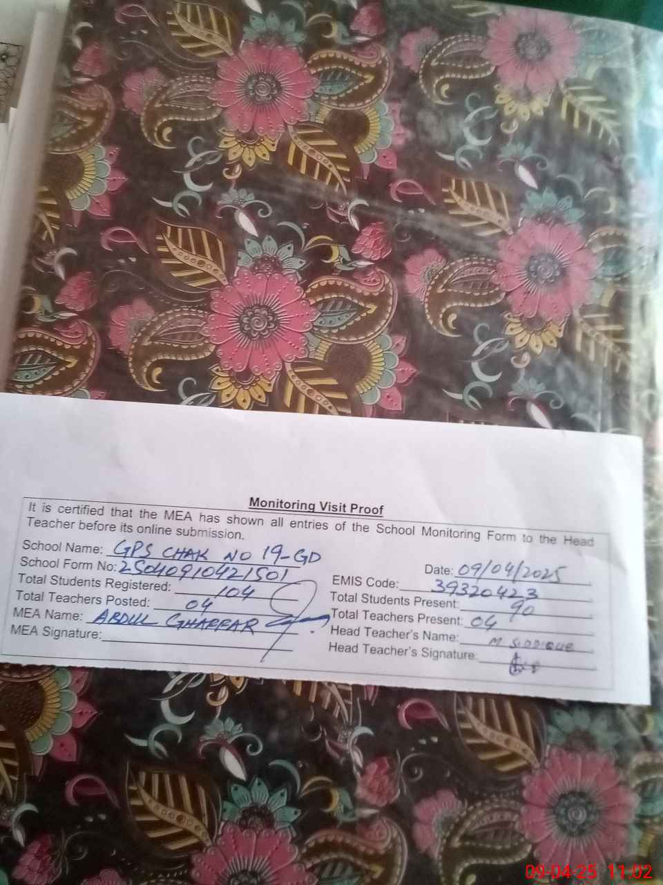 | EMIS Code: 39320423 | Name of School: GPS CHAK NO.19/G.D | |||