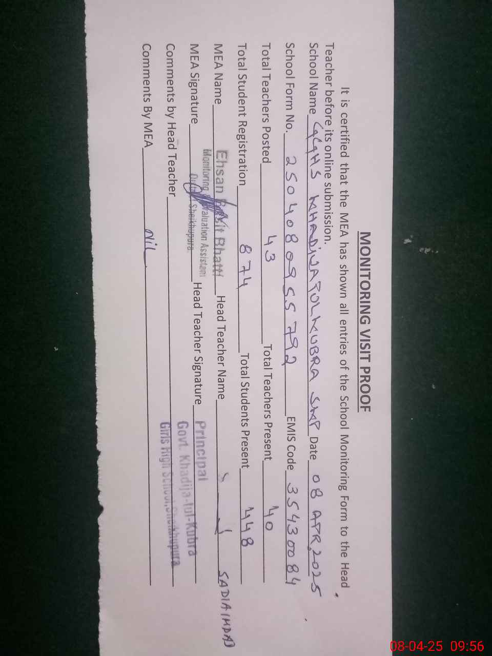 | Attendance Register | Head Teacher | MEA with School | Visit Proof |