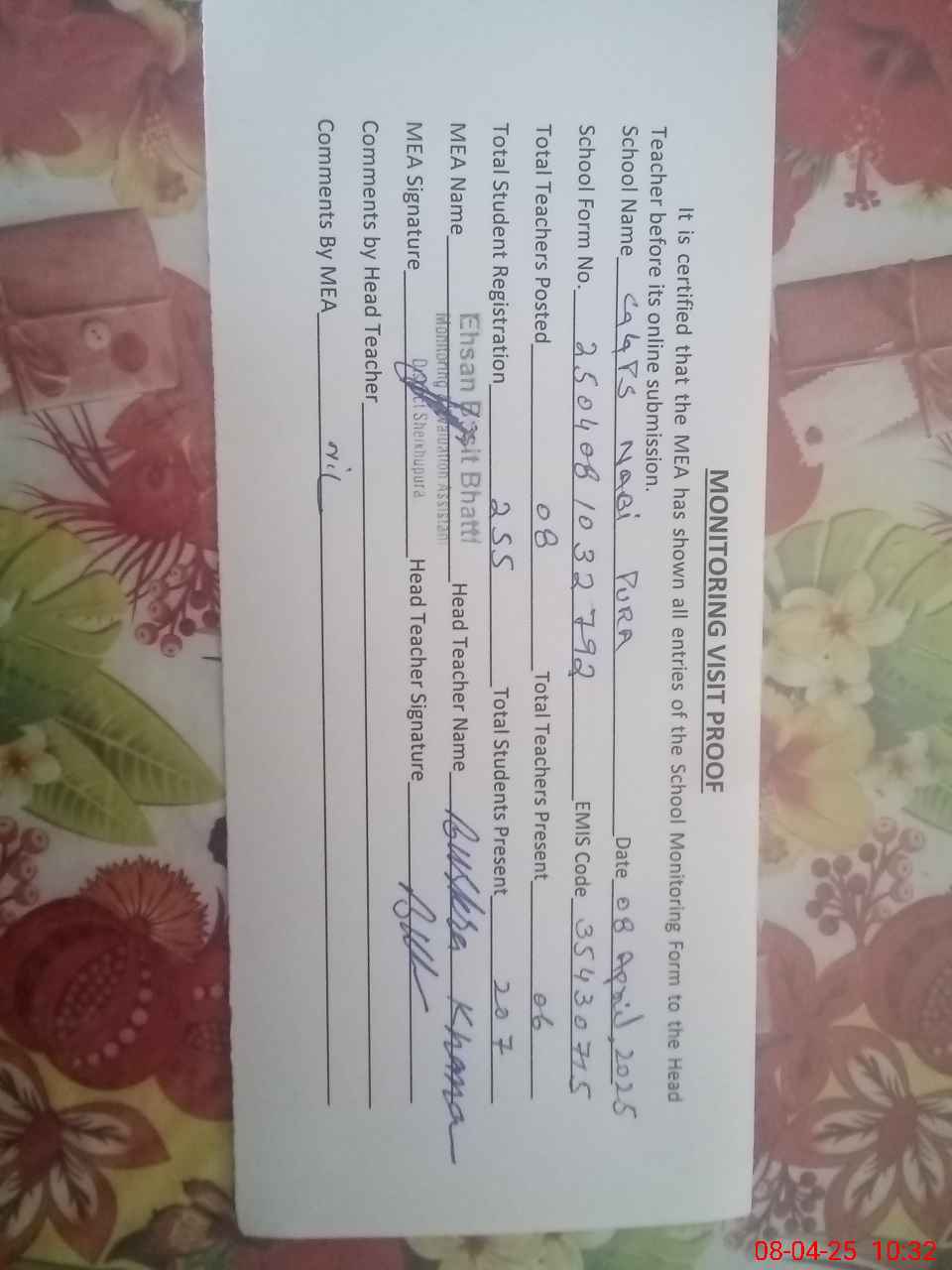 | Certified that this School was Inspected by the Undersigned MEA/DMO Today and the Information Stated Above is as Per Record. | |||||