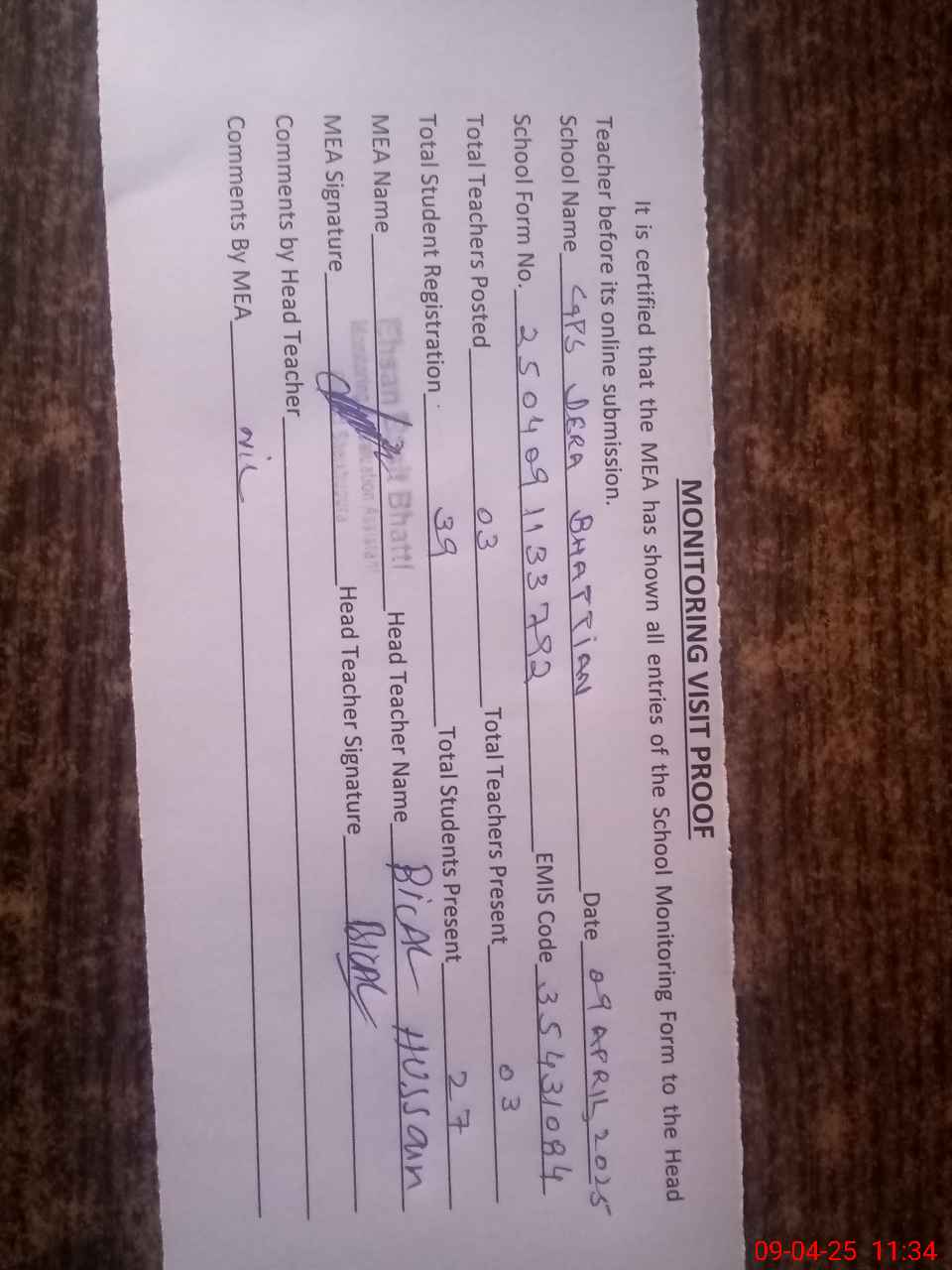 | EMIS Code: 35431084 | Name of School: GPS DERA BHATTIAN | |||