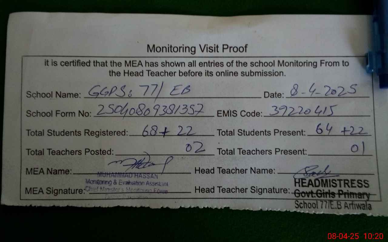 | EMIS Code: 39220415 | Name of School: GGPS 77 EB ARIFWALA | |||