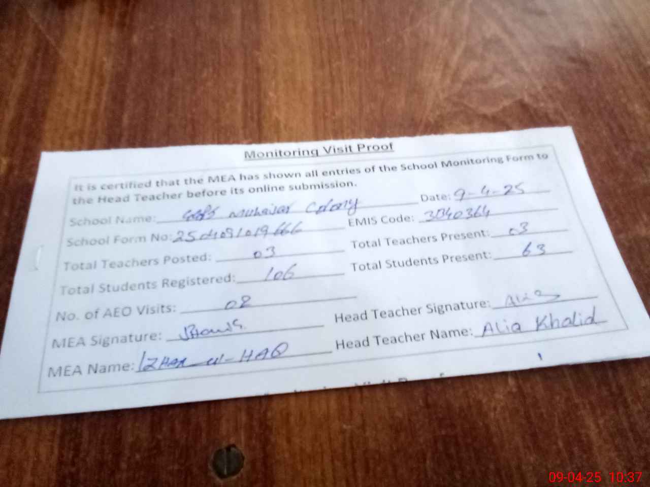 | Attendance Register | Head Teacher | MEA with School | Visit Proof |