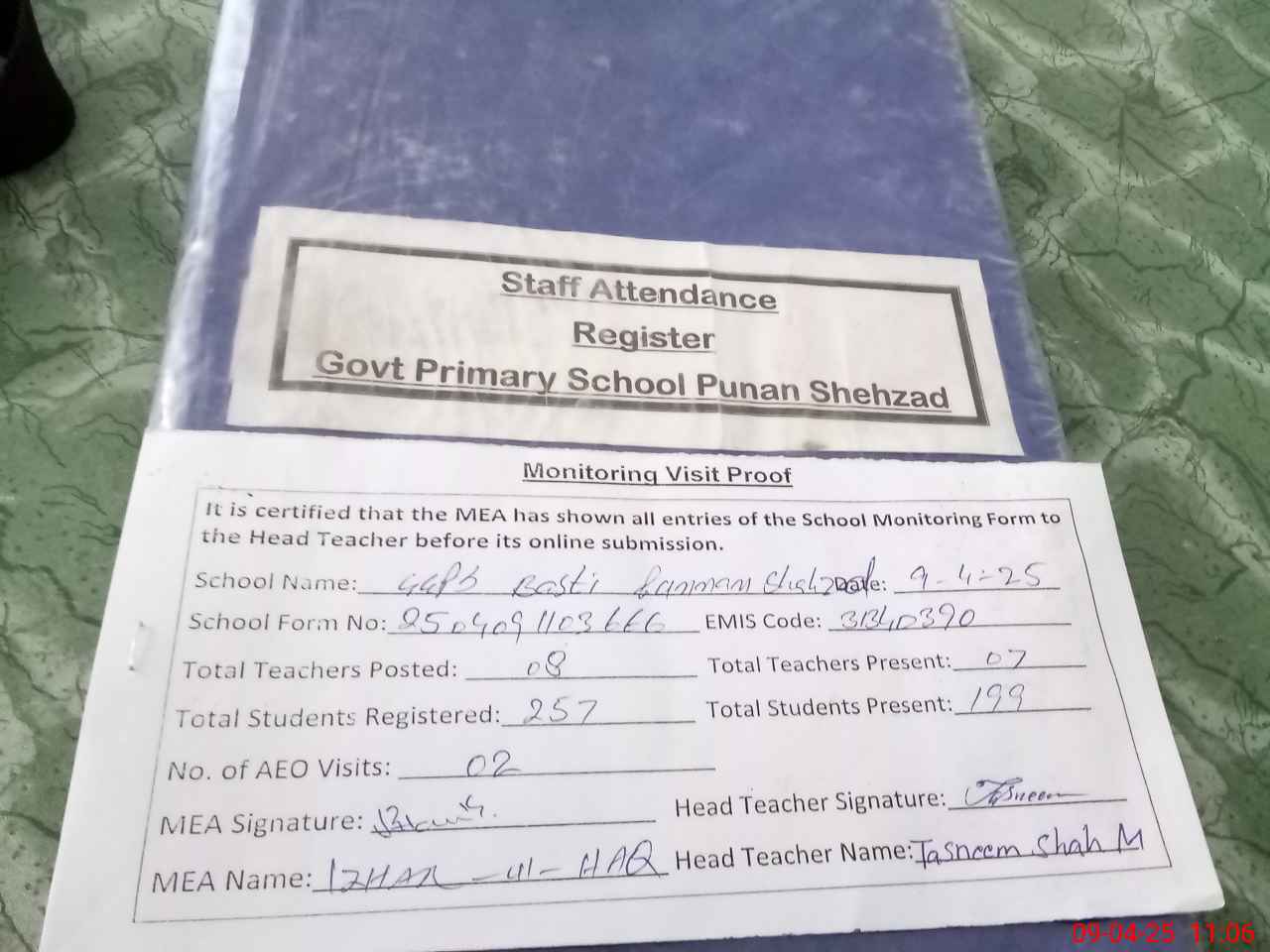 | Attendance Register | Head Teacher | MEA with School | Visit Proof |