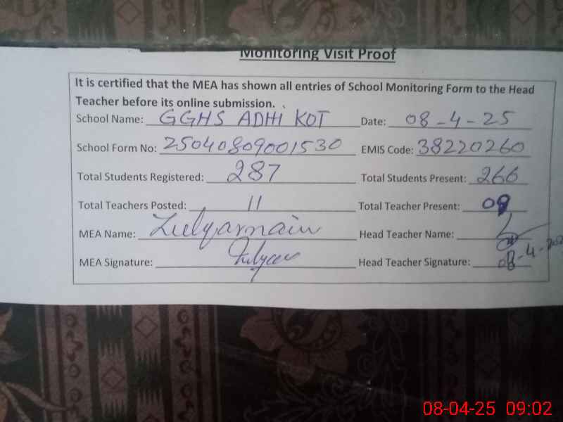 | EMIS Code: 38220260 | Name of School: GGHS ADHI KOT | |||