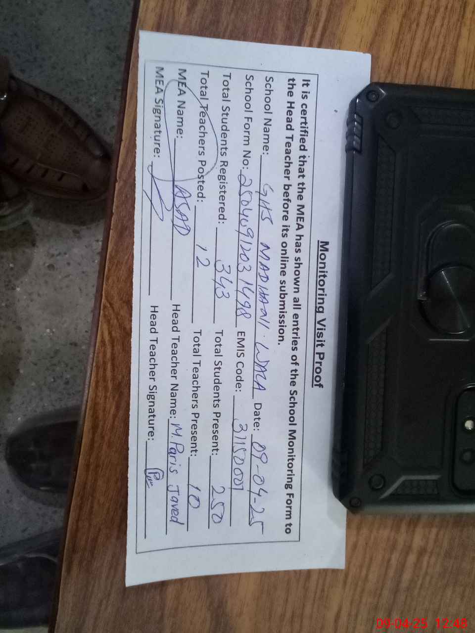 | EMIS Code: 31150001 | Name of School: GHS MADHANI WALA MINCHIN ABAD | |||