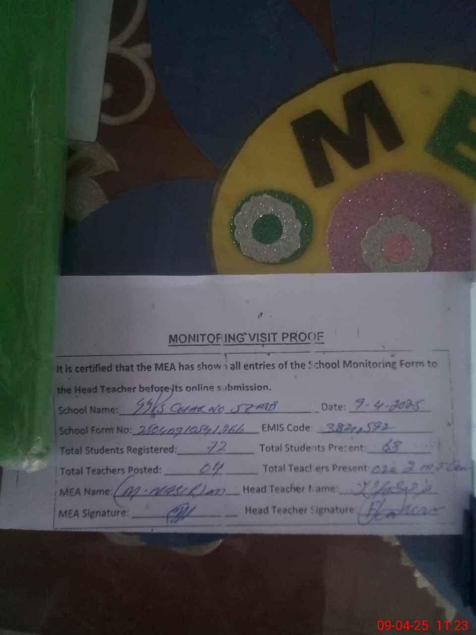 | Attendance Register | Head Teacher | MEA with School | Visit Proof |