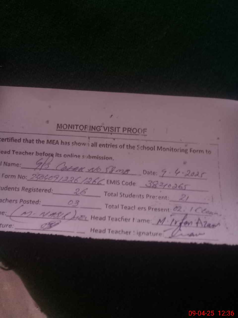 | Attendance Register | Head Teacher | MEA with School | Visit Proof |