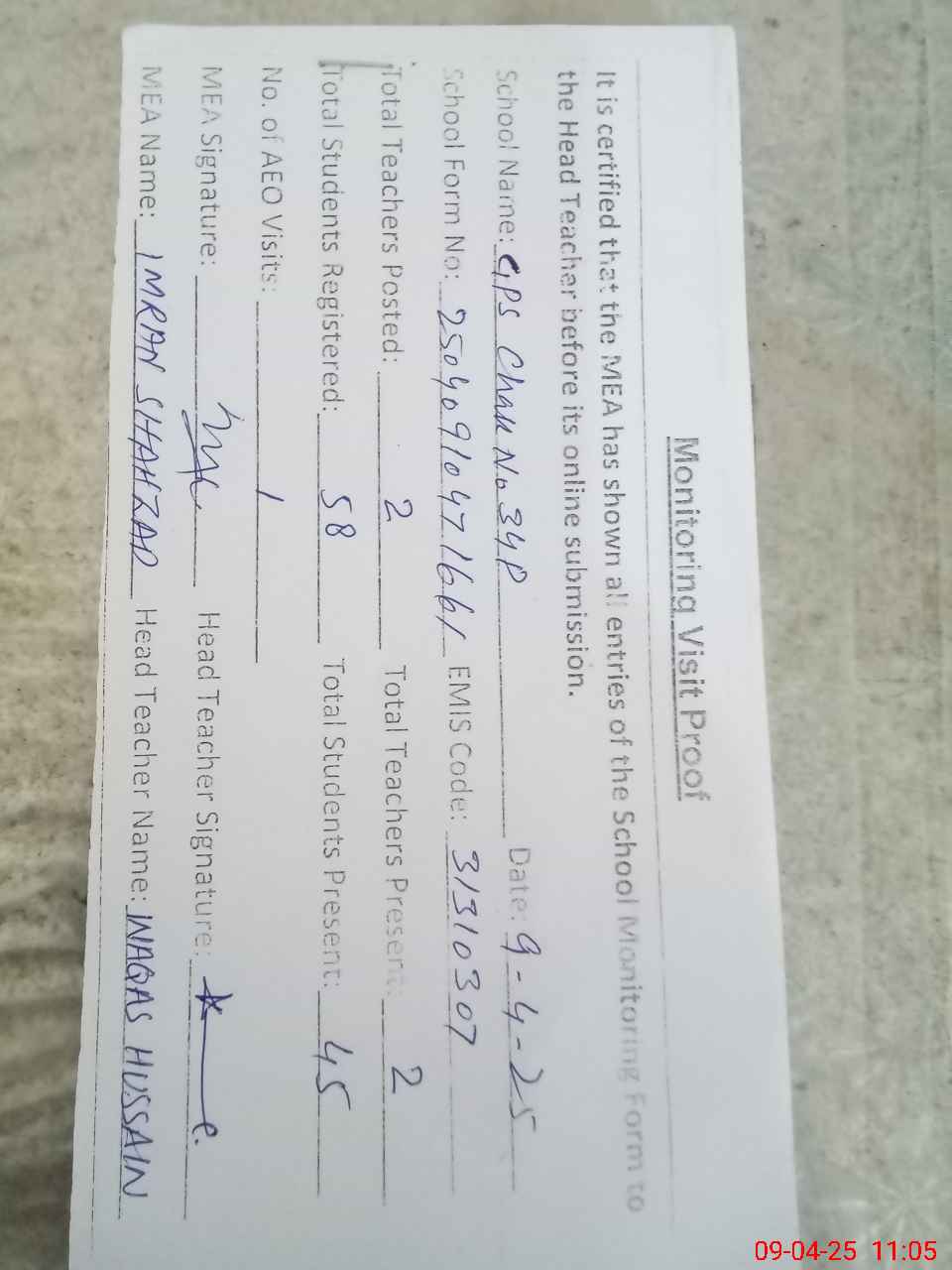 | EMIS Code: 31310307 | Name of School: GPS CHAK NO. 34/P | |||