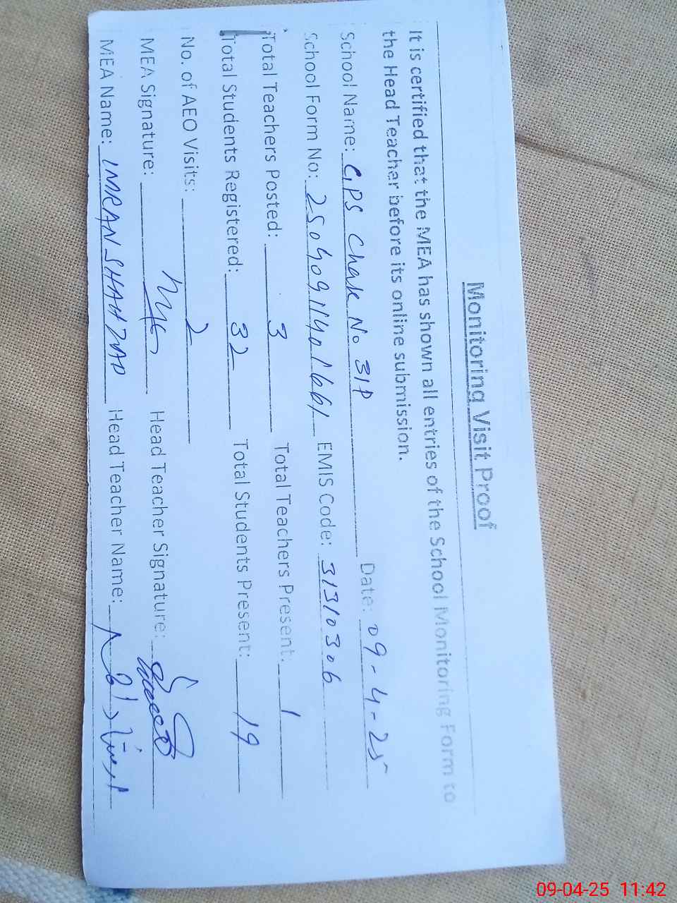 | Attendance Register | Head Teacher | MEA with School | Visit Proof |