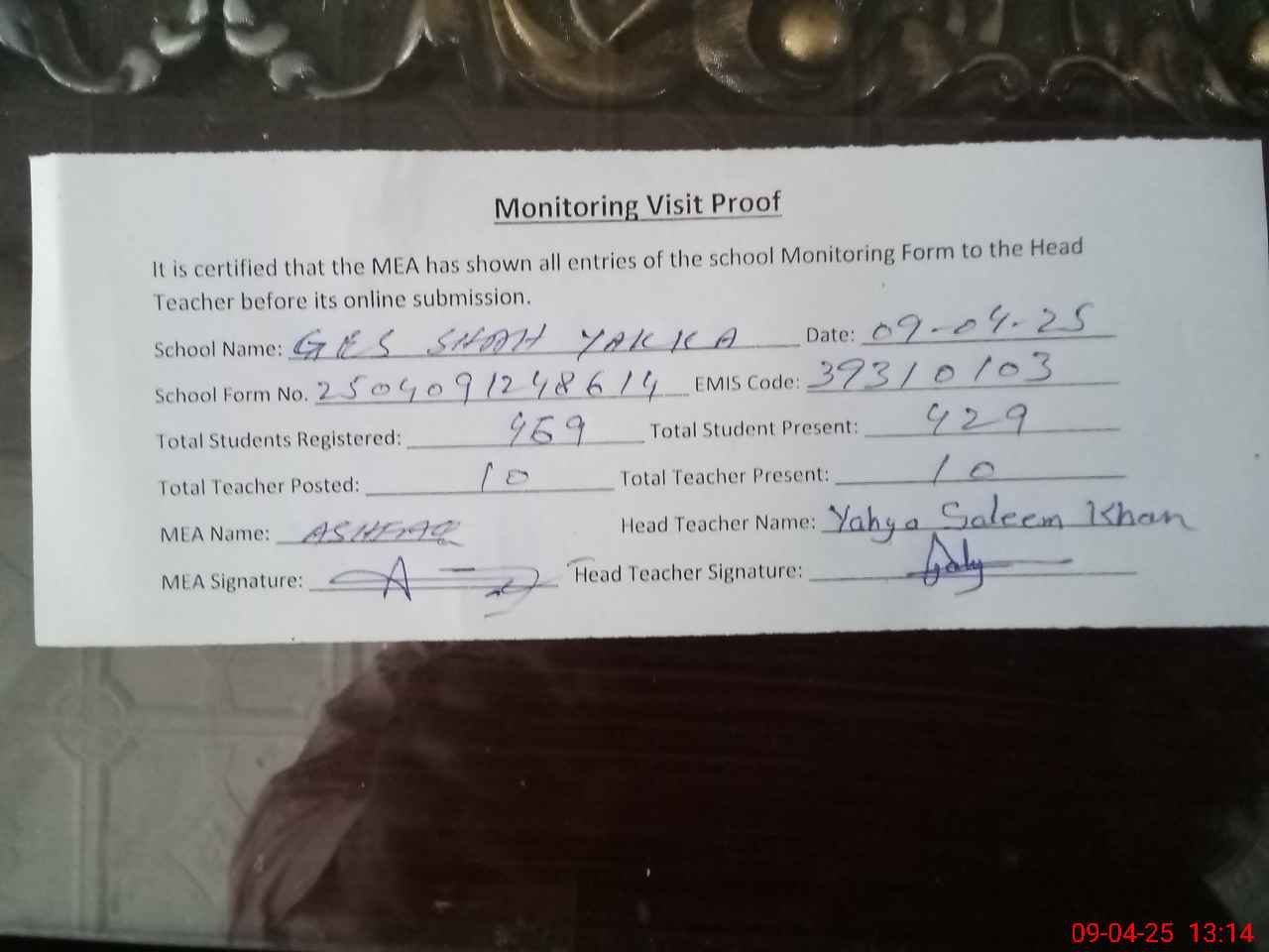 | Attendance Register | Head Teacher | MEA with School | Visit Proof |