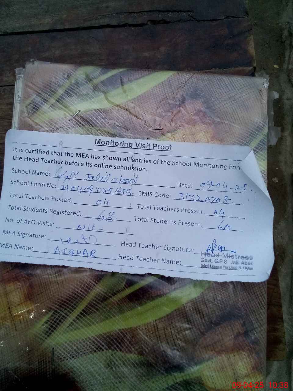 | Attendance Register | Head Teacher | MEA with School | Visit Proof |