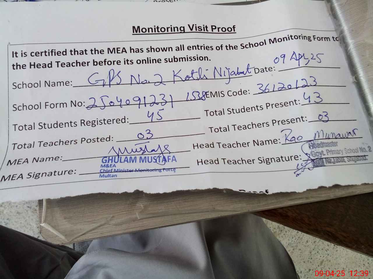| Attendance Register | Head Teacher | MEA with School | Visit Proof |