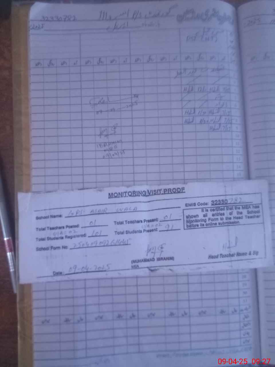 | Attendance Register | Head Teacher | MEA with School | Visit Proof |