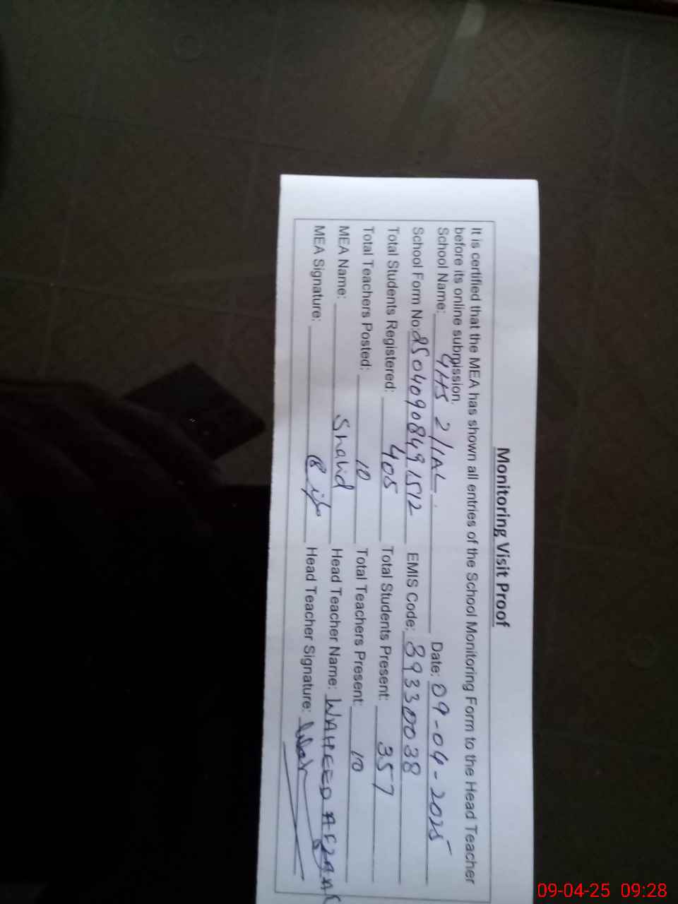 | Attendance Register | Head Teacher | MEA with School | Visit Proof |