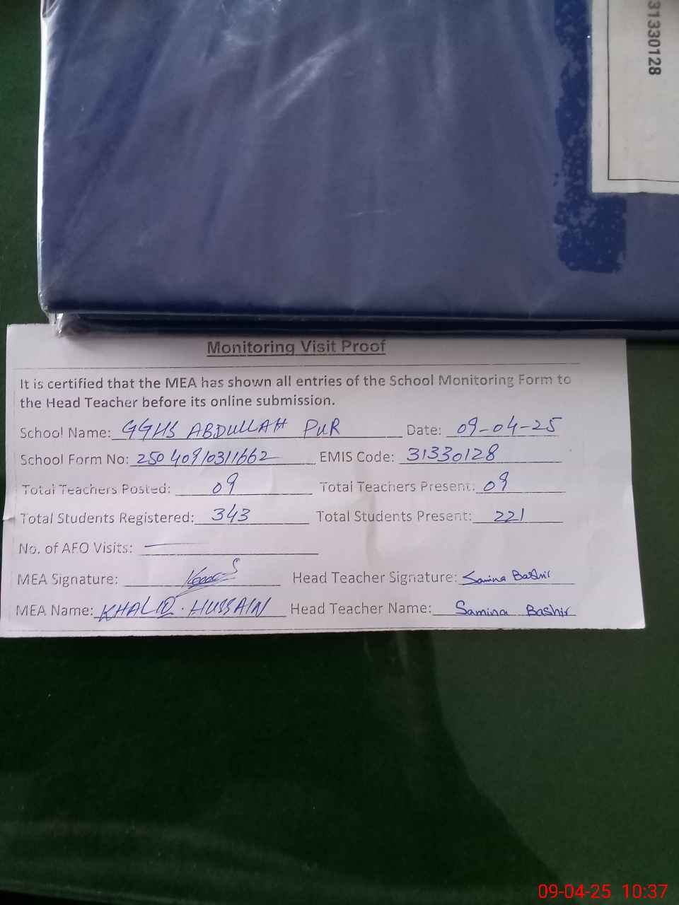| Attendance Register | Head Teacher | MEA with School | Visit Proof |