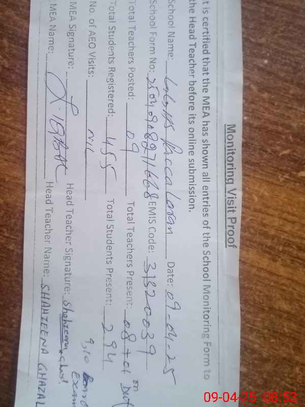 | Certified that this School was Inspected by the Undersigned MEA/DMO Today and the Information Stated Above is as Per Record. | |||||