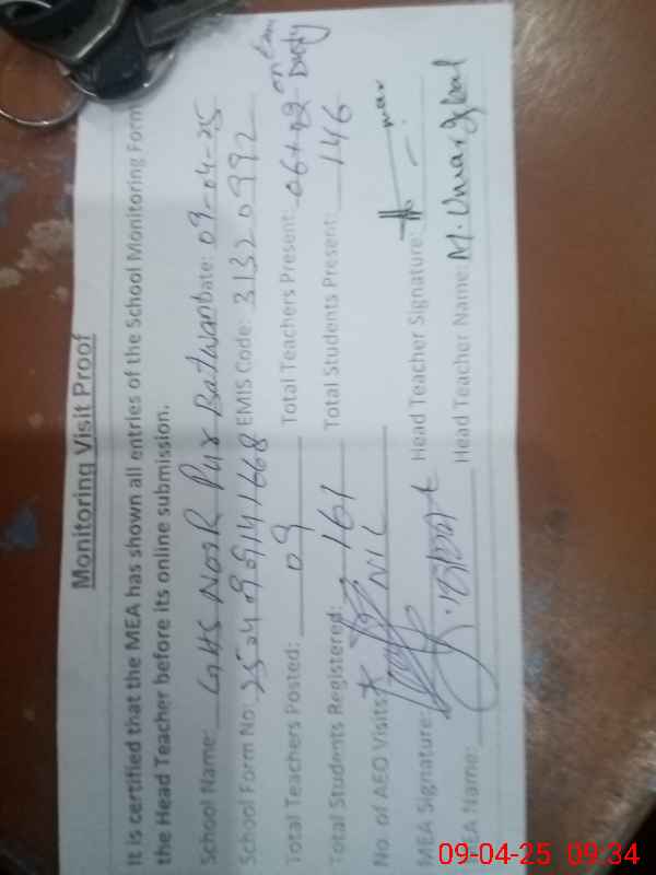 | Attendance Register | Head Teacher | MEA with School | Visit Proof |