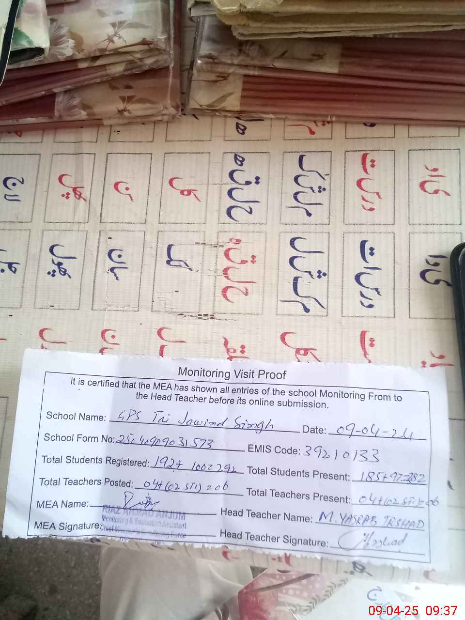 | Attendance Register | Head Teacher | MEA with School | Visit Proof |