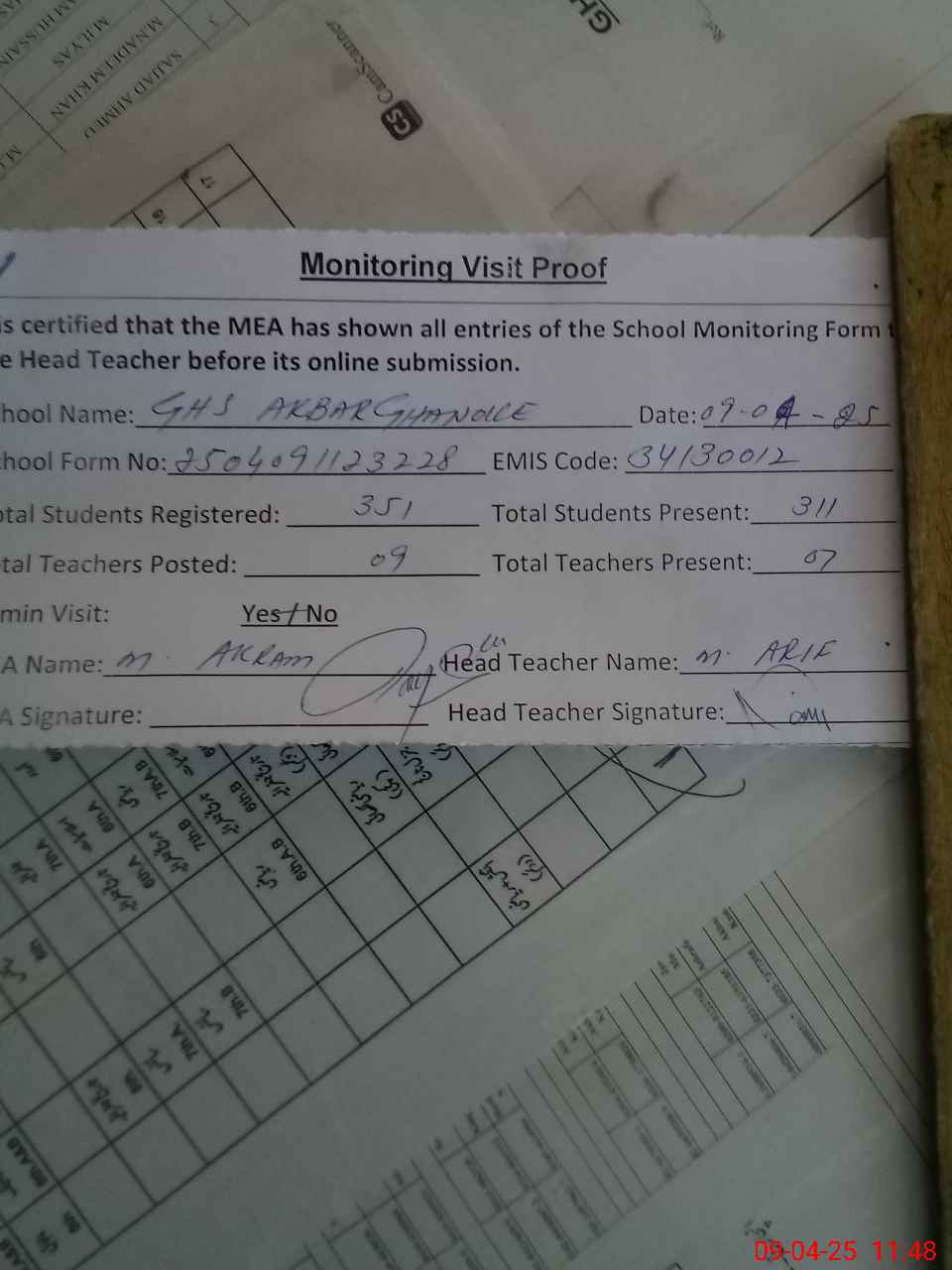 | Attendance Register | Head Teacher | MEA with School | Visit Proof |
