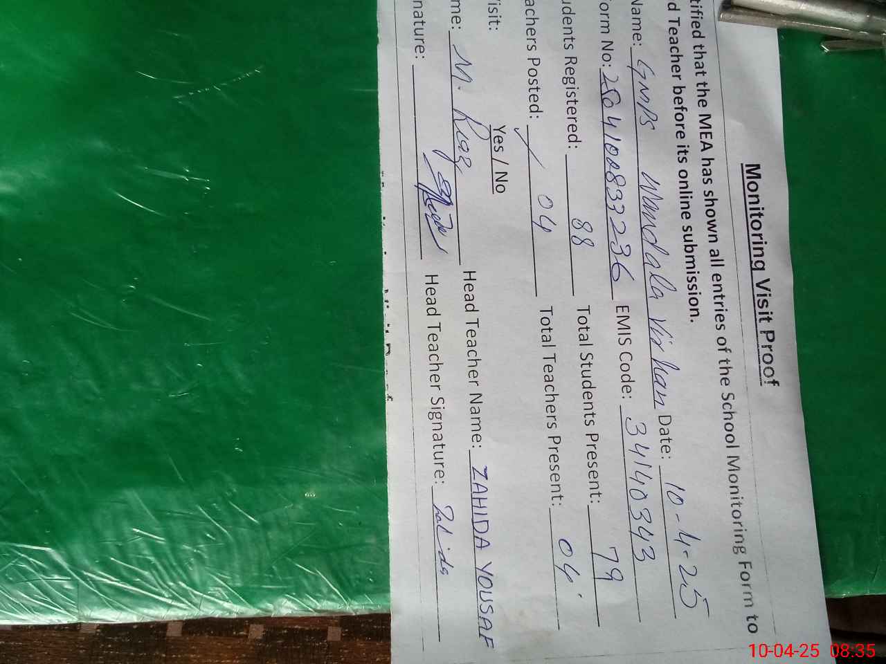 | Attendance Register | Head Teacher | MEA with School | Visit Proof |