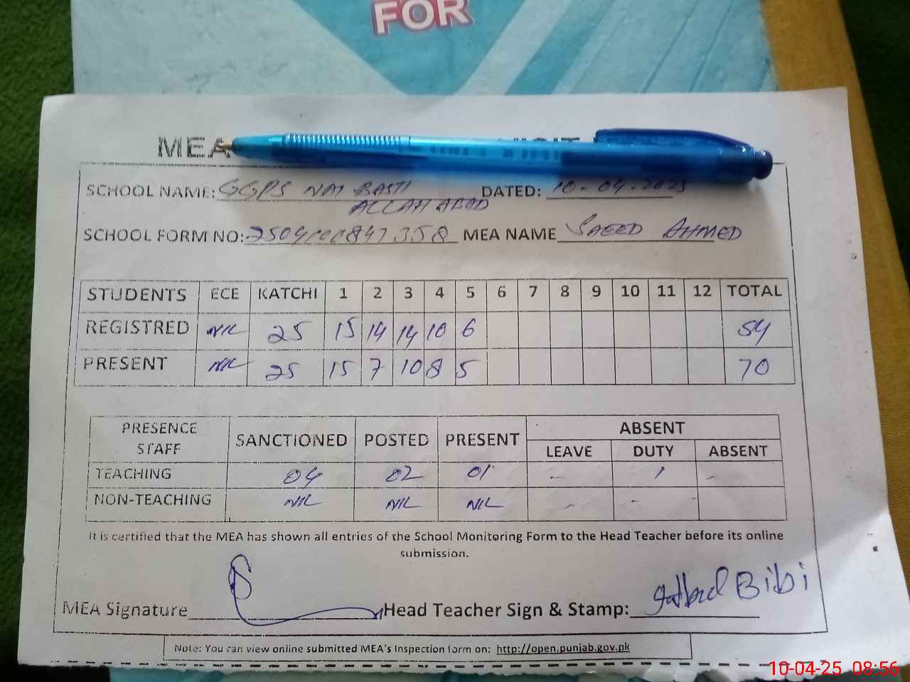 | Attendance Register | Head Teacher | MEA with School | Visit Proof |
