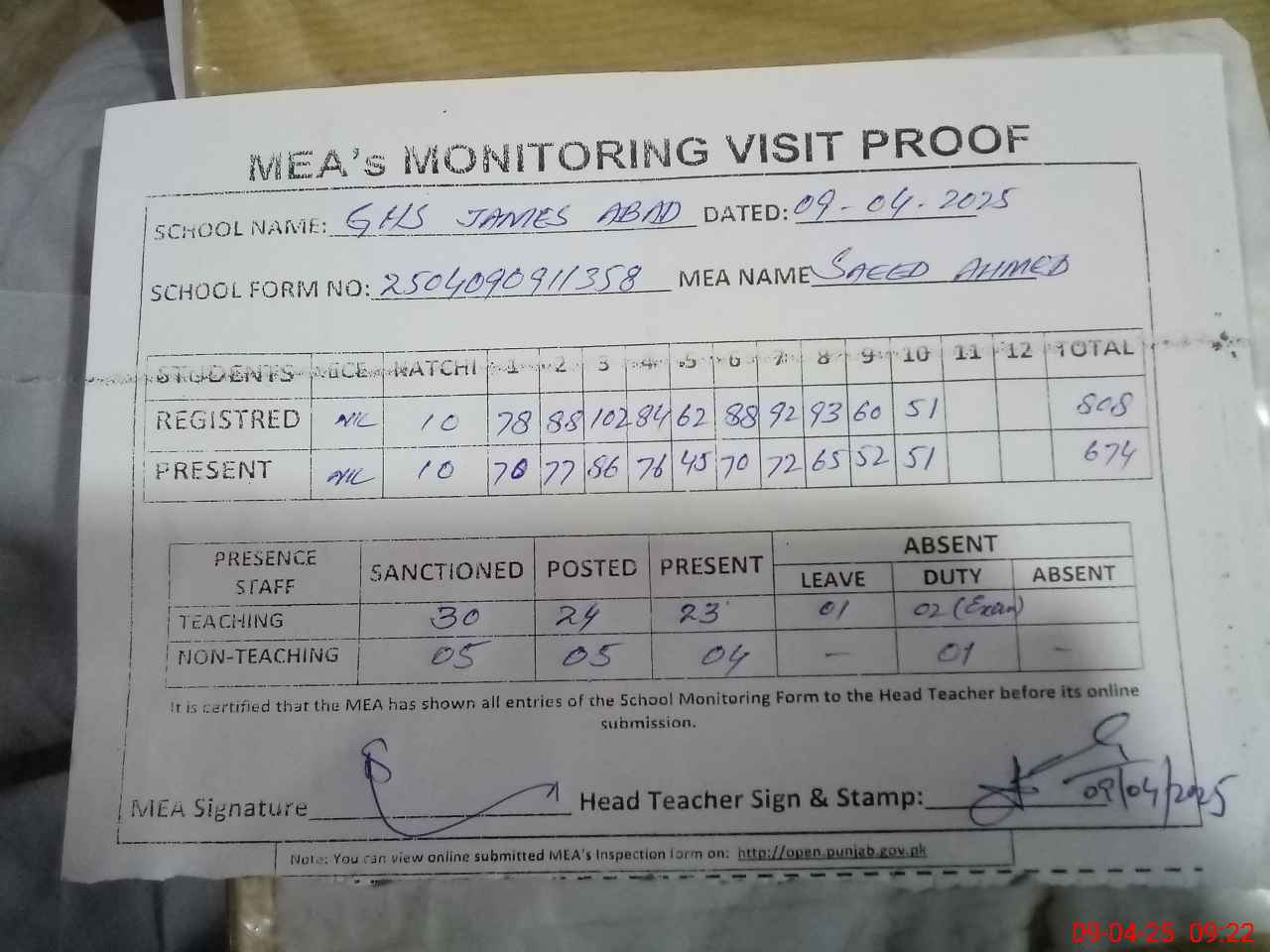 | Attendance Register | Head Teacher | MEA with School | Visit Proof |
