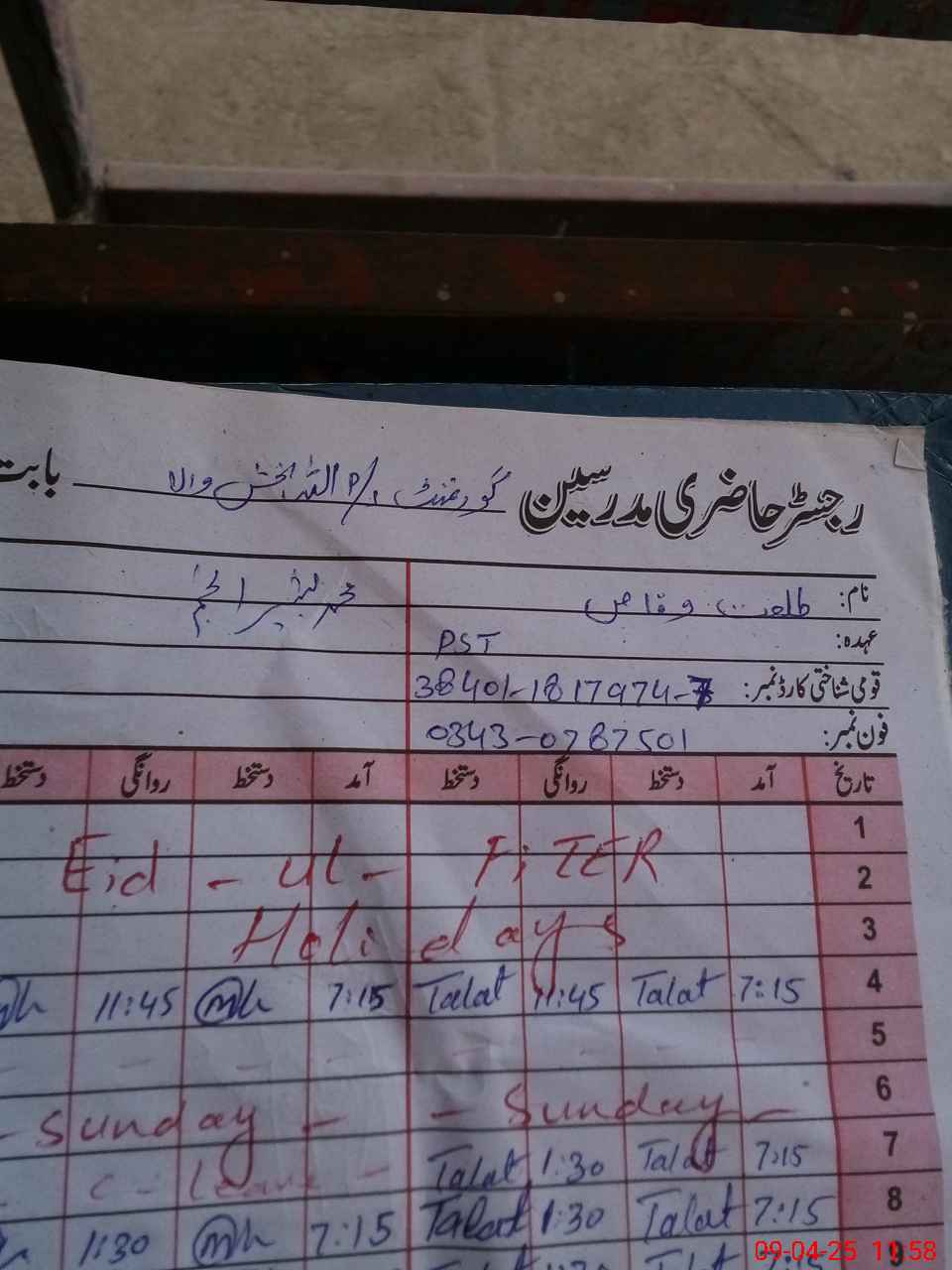 | Name: TA**** WA**** Designation: (School Headmaster's/Headmistress's) PST Phone/Cell Number: 03**** |