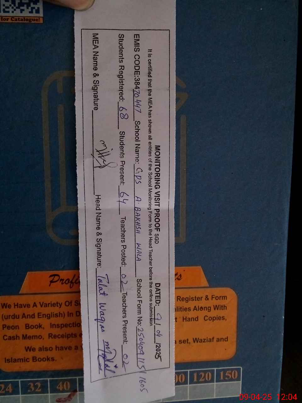 | Attendance Register | Head Teacher | MEA with School | Visit Proof |