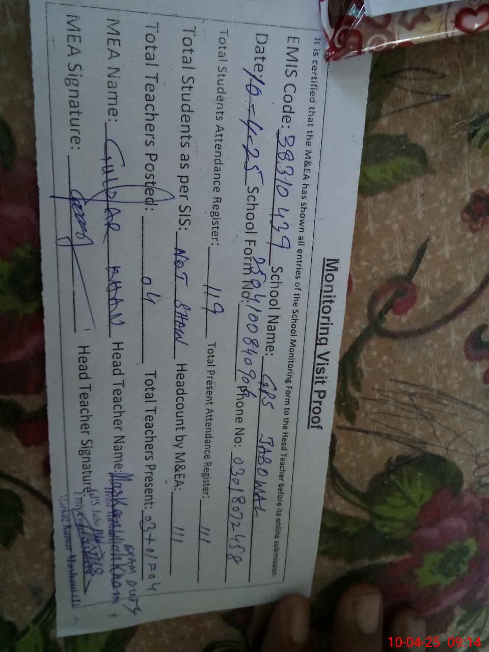 | Attendance Register | Head Teacher | MEA with School | Visit Proof |