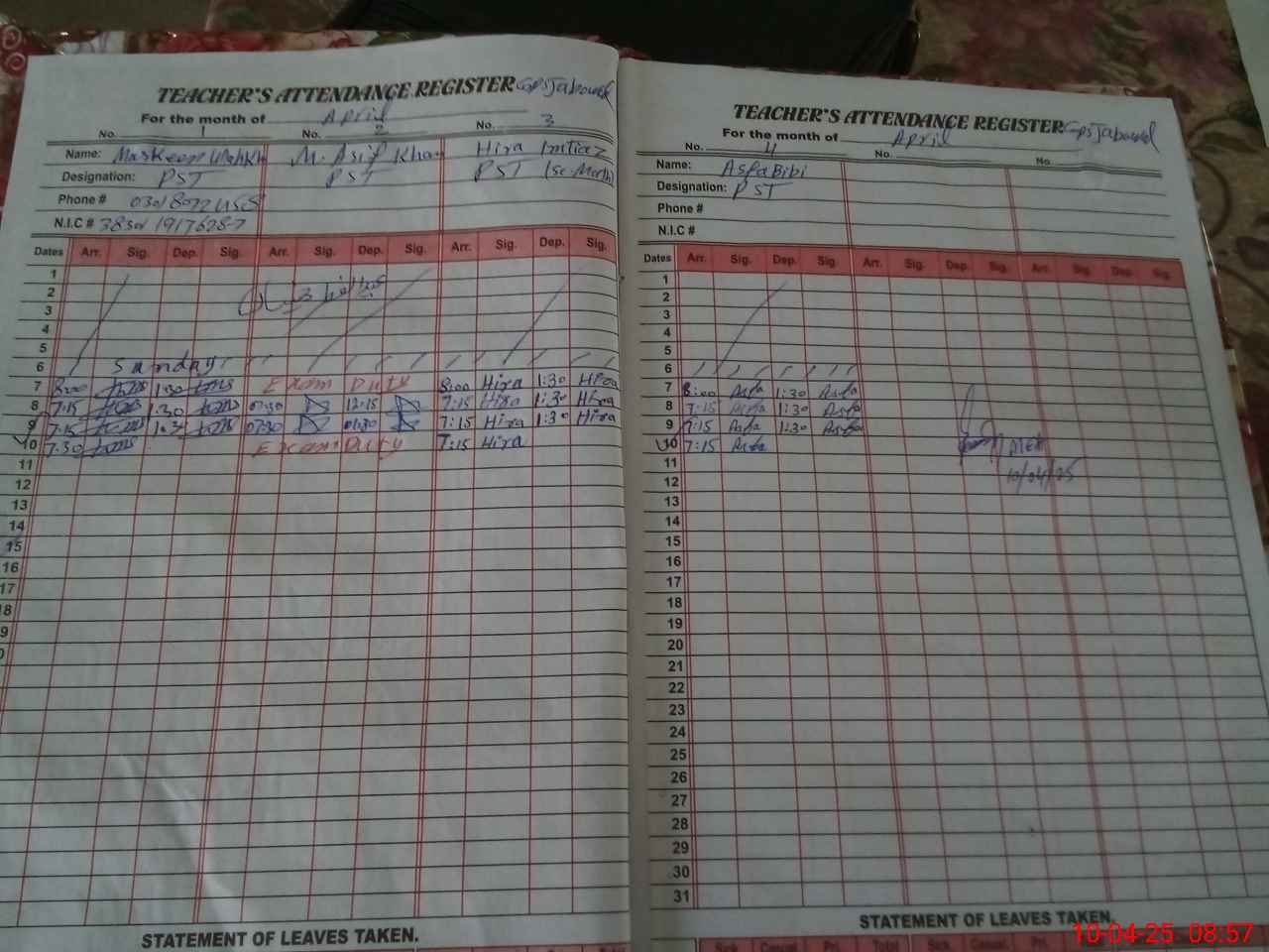 | 38**** | Mo**** As**** Kh**** | PST | Regular | 2 | 8 | 0 | 0 | 0 | 0 | 0 | 0 | 2 | Exam Duty |