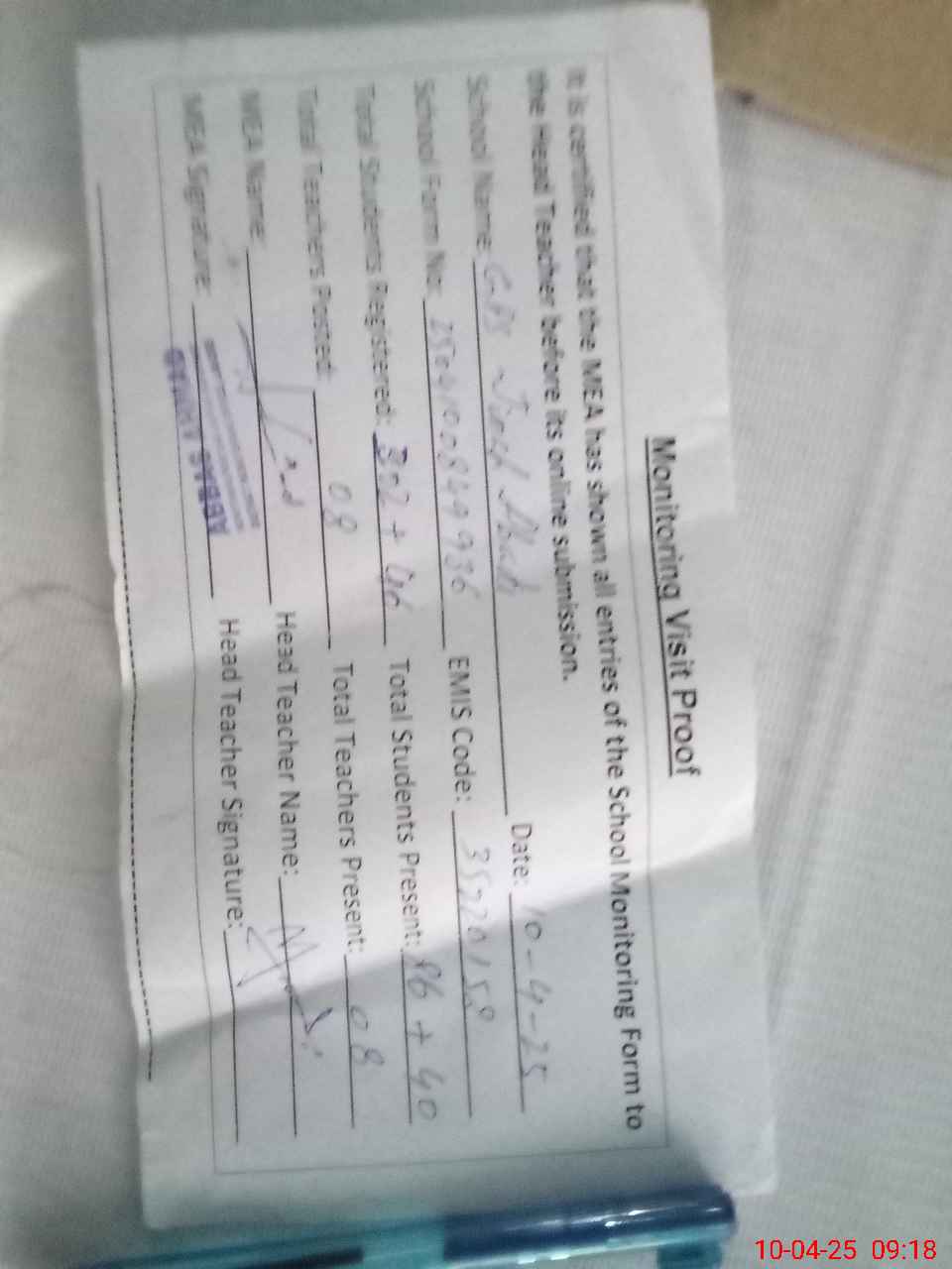 | Attendance Register | Head Teacher | MEA with School | Visit Proof |
