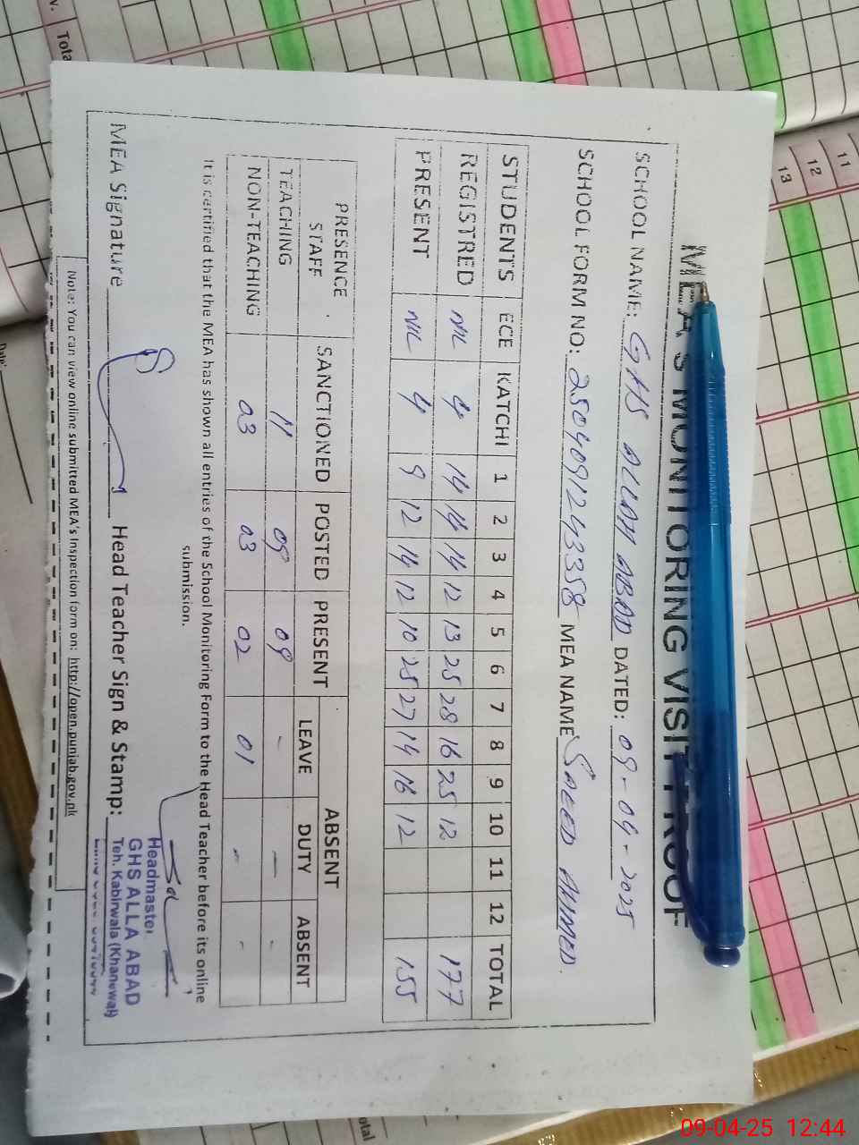 | EMIS Code: 36410044 | Name of School: GHS ALLAH ABAD, KABIRWALA | |||