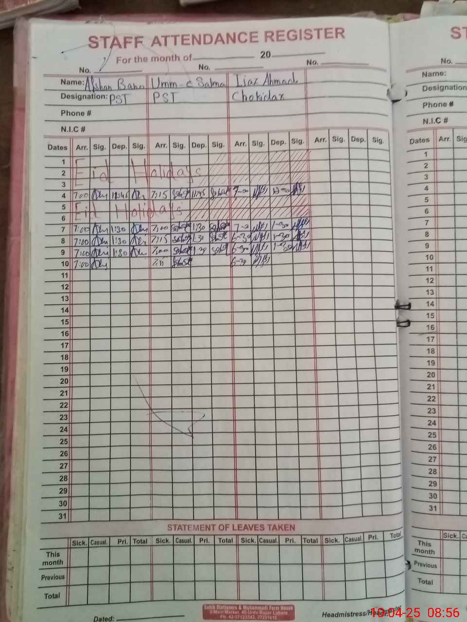 | Leave | Duty | Absent | Maternity | Medical | Ex- Pak |