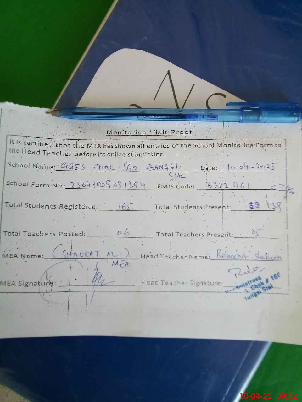 | EMIS Code: 33221161 | Name of School: GGES CHAK NO 160 BUNGSI SIAL | |||