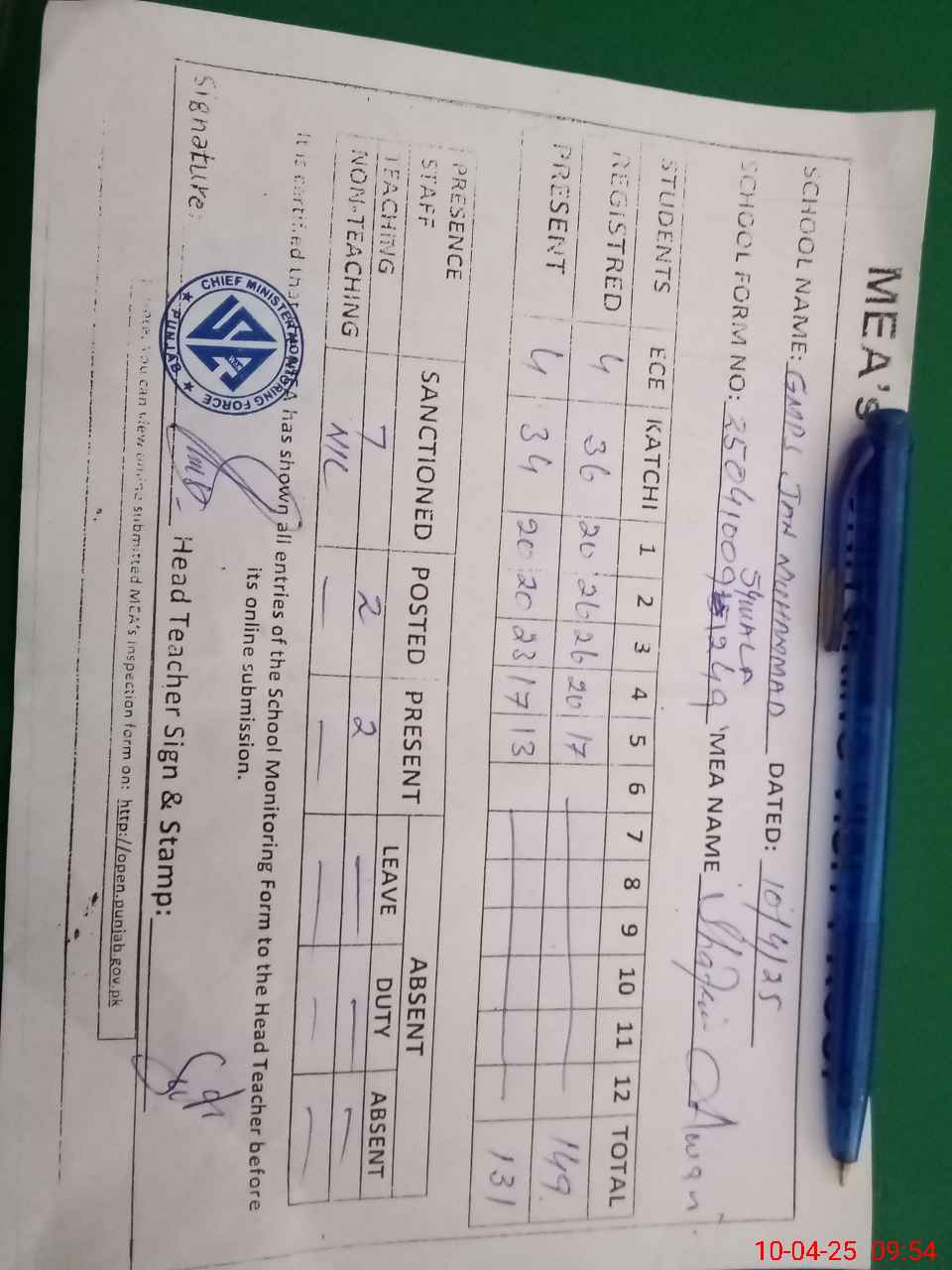 | Attendance Register | Head Teacher | MEA with School | Visit Proof |