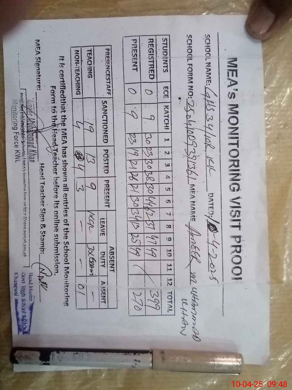 | Attendance Register | Head Teacher | MEA with School | Visit Proof |