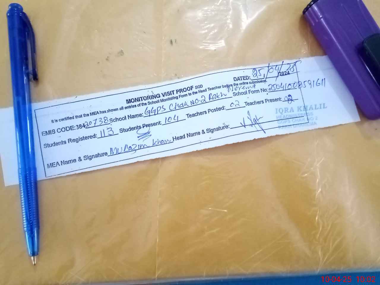 | Attendance Register | Head Teacher | MEA with School | Visit Proof |
