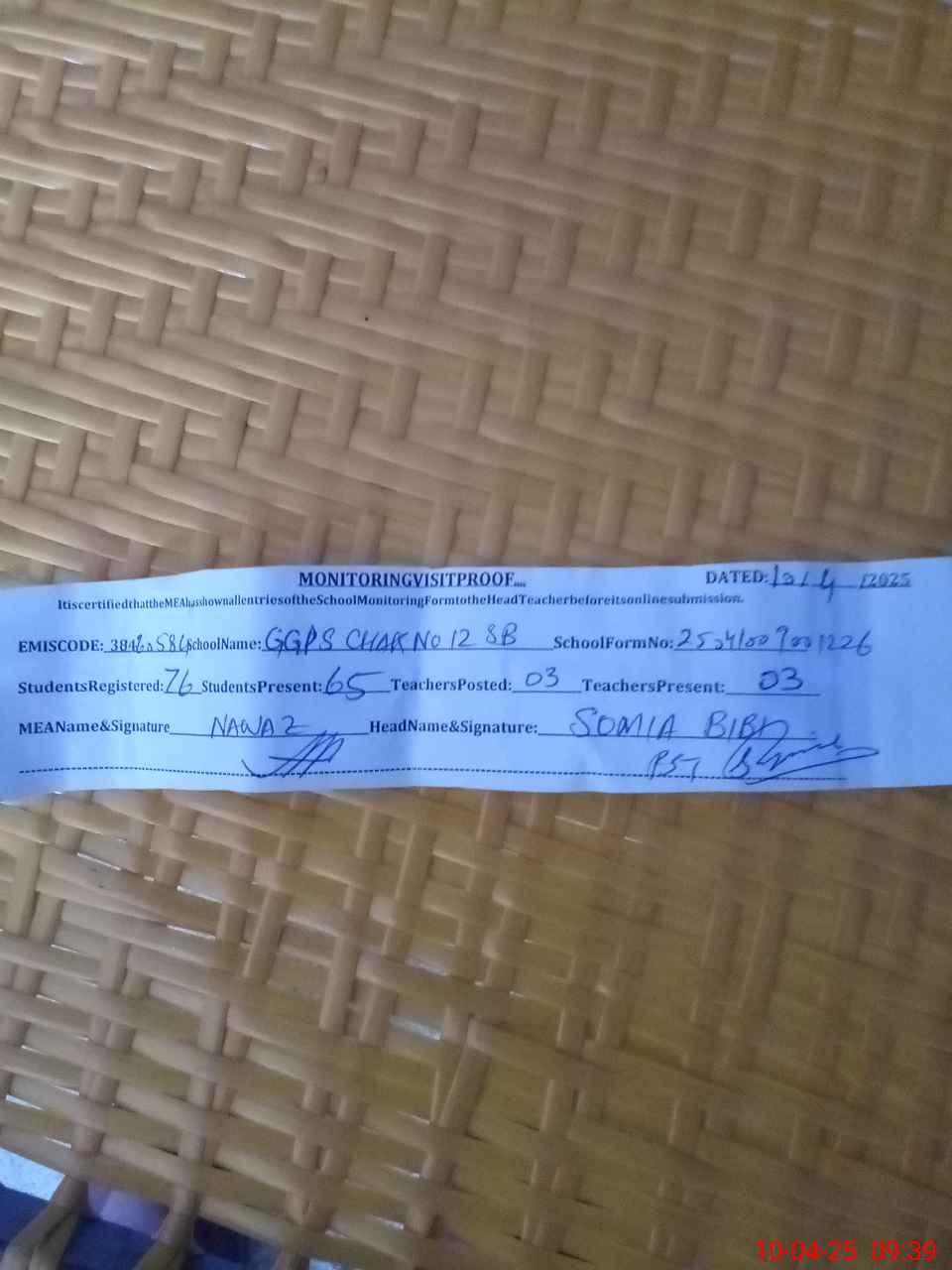 | EMIS Code: 38460584 | Name of School: GGPS CHAK NO.12 SB | |||