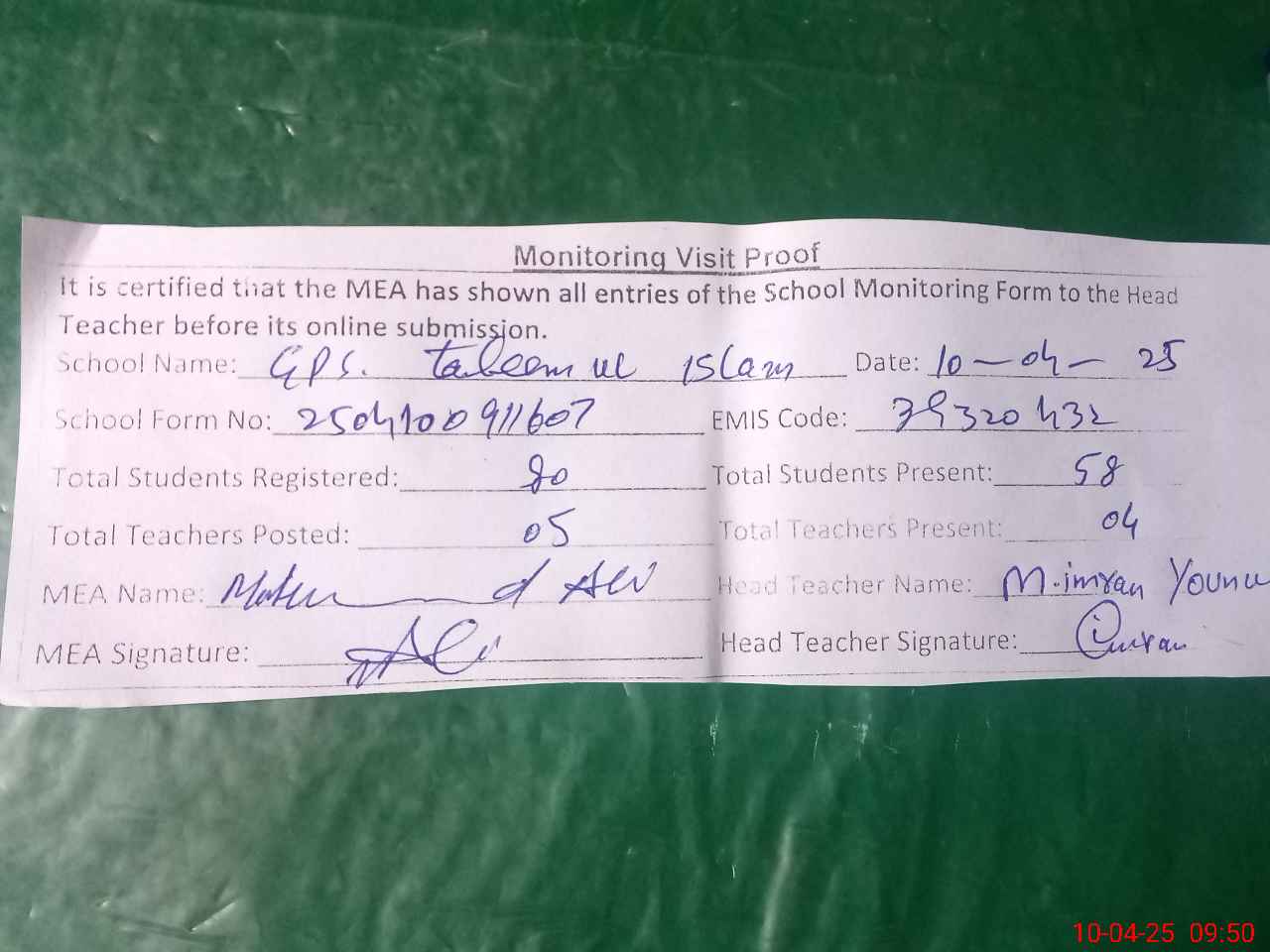 | Attendance Register | Head Teacher | MEA with School | Visit Proof |