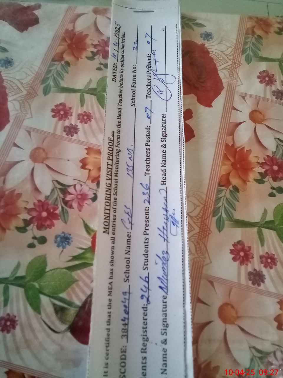| Attendance Register | Head Teacher | MEA with School | Visit Proof |