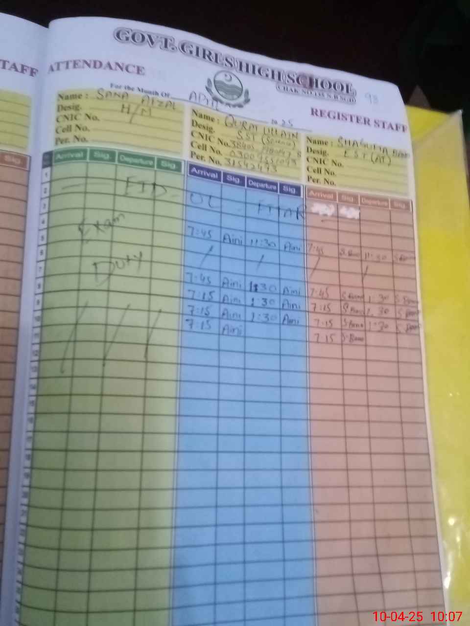 | CNIC | Full Name | Designation | R/C | Absence During Last Calender Month |