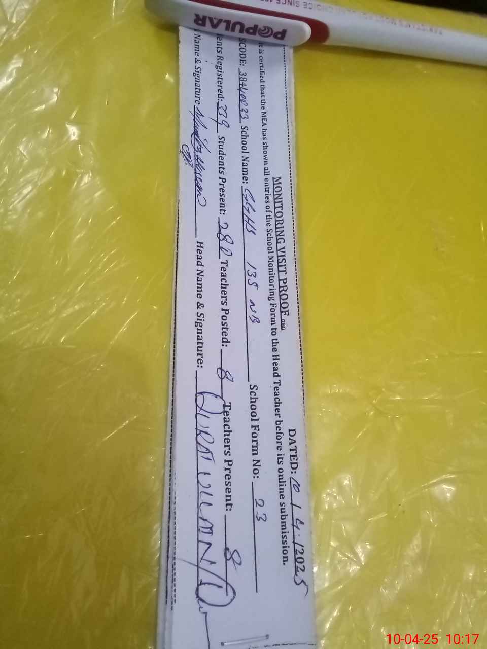 | Attendance Register | Head Teacher | MEA with School | Visit Proof |